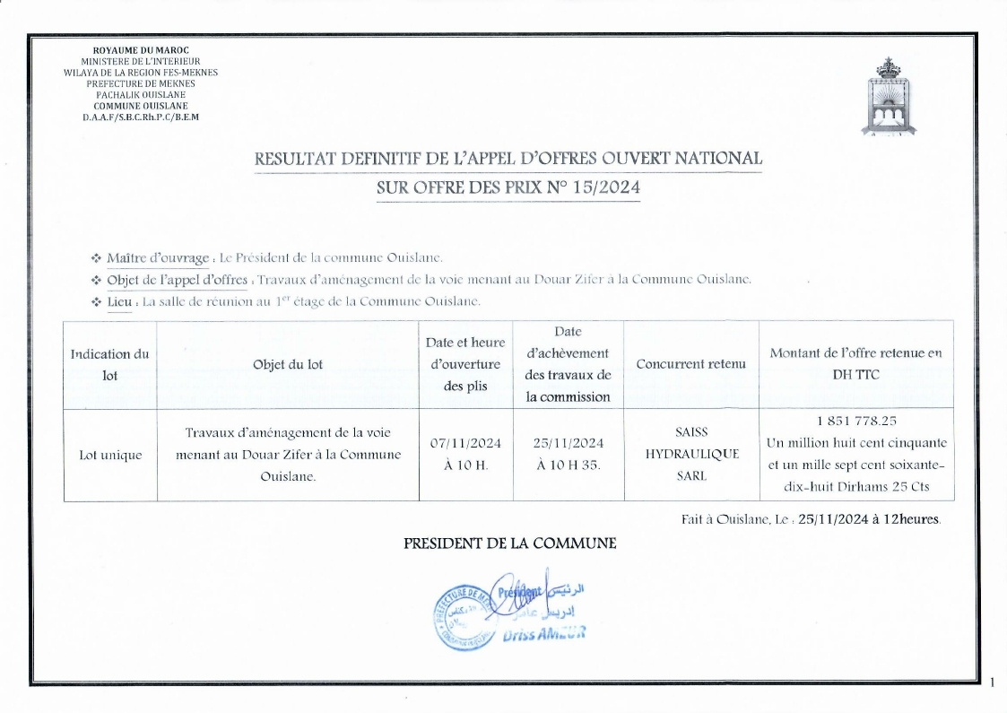 Résultat de l'appel d'offres ouvert national N° 15/2024