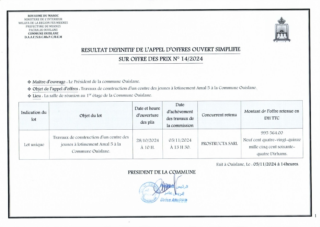Résultat de l'appel d'offres ouvert simplifié N° 14/2024